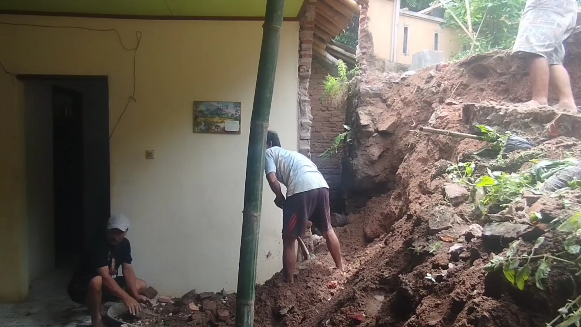 Dalam rekaman video amatir kondisi longsor yang terjadi di Dusun Sampora, Desa Purwasari, Kabupaten Kuningan, Jawa Barat, pada Selasa siang. Tebing penahan tanah setinggi dua meter longsor dan menimpa rumah warga.