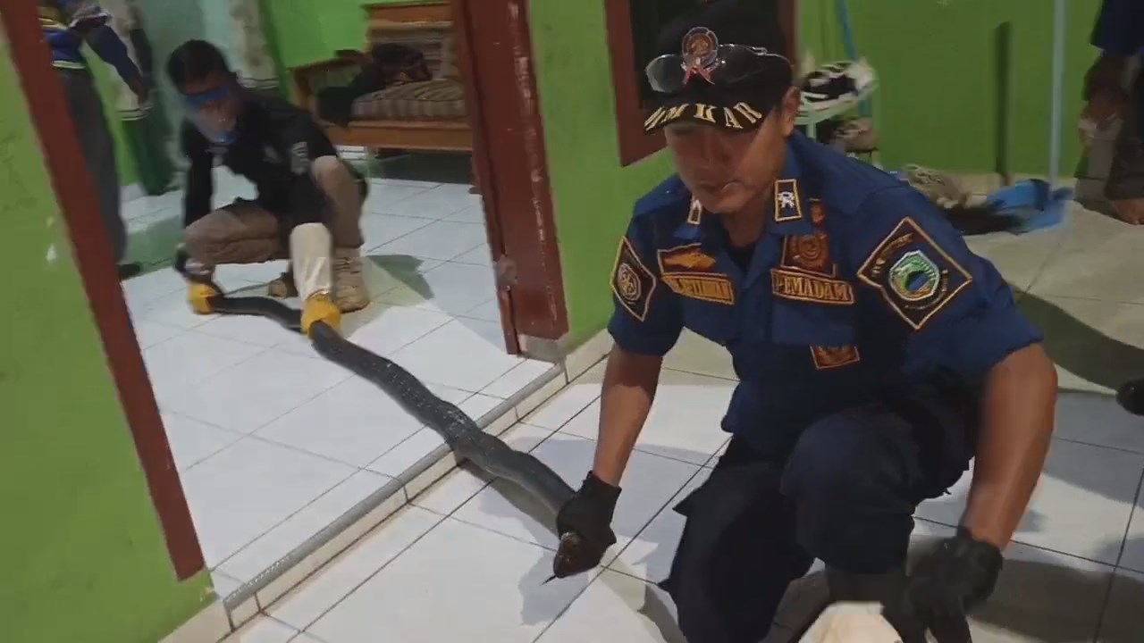 KUNINGAN, PILARadio – Seekor ular king kobra berukuran besar masuk ke dapur rumah warga di Desa Kramatwangi, Kecamatan Garawangi, Kabupaten Kuningan, Jawa Barat, pada Minggu pagi. Proses evakuasi berlangsung cukup sulit karena ular tersebut bersembunyi di bawah rak dan sempat menyerang petugas.