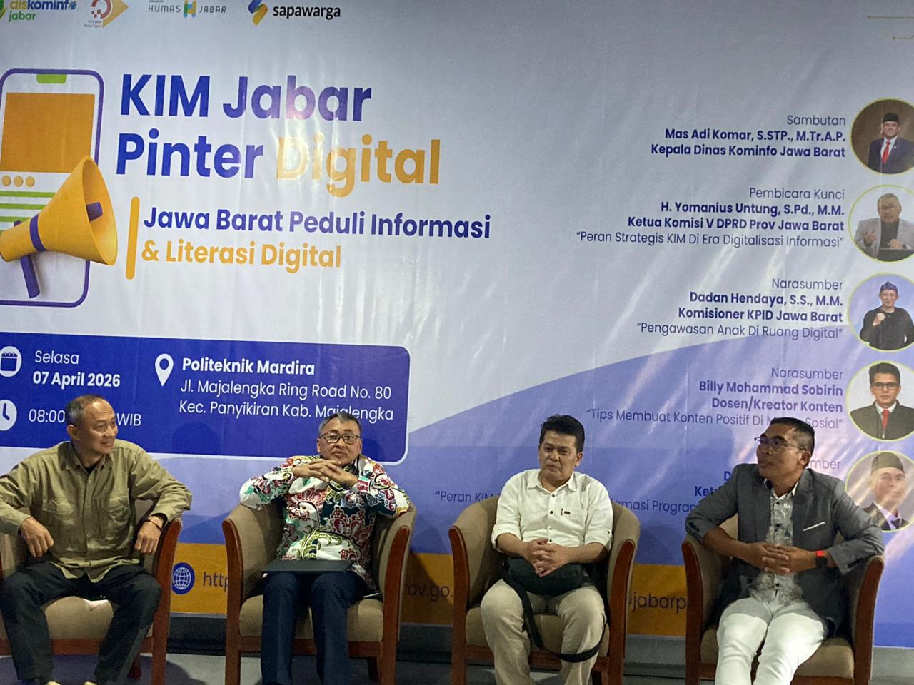 MAJALENGKA, PILARadio – Bertempat di Gedung Politeknik Mardira Indonesia di Majalengka, Selasa 7 april 2026, Komunitas Informasi Masyarakat (KIM) terus menunjukkan perannya dalam mendukung literasi digital di Jawa Barat melalui kegiatan KIM Jabar Pinter Digital yang mengusung tema “Jawa Barat Peduli Informasi & Literasi Digital”. Acara ini menghadirkan berbagai narasumber dari unsur pemerintahan, legislatif, hingga praktisi digital.