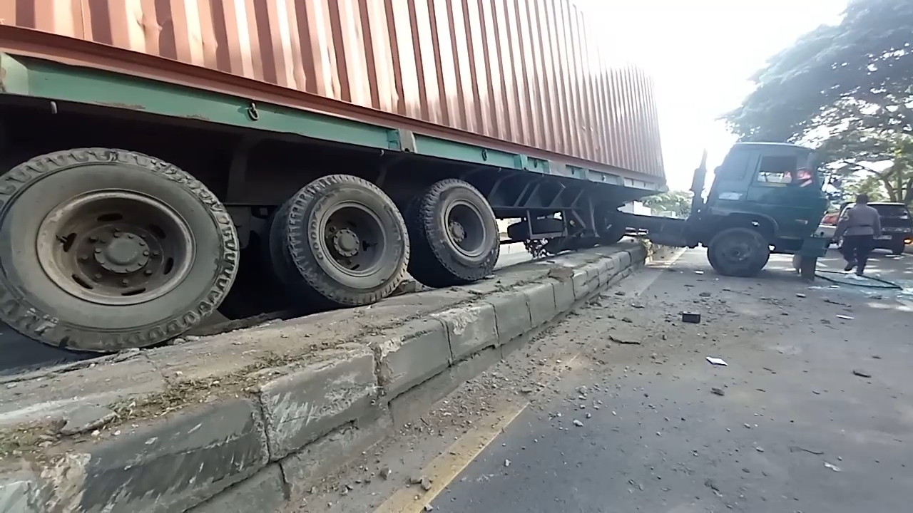 “Truk kontainer yang melaju dari arah Jakarta menuju Jawa oleng dan menghantam trotoar hingga nyangkut serta melintang menutup sebagian jalan. Diduga kecelakaan ini terjadi akibat pengemudi mengantuk dan terkejut saat menghindari sepeda motor. Untuk korban sendiri tidak ada hanya pengemudi mengalami luka ringan saja” Ujar Kapolsek Gebang, AKP Wawan Hermawan.