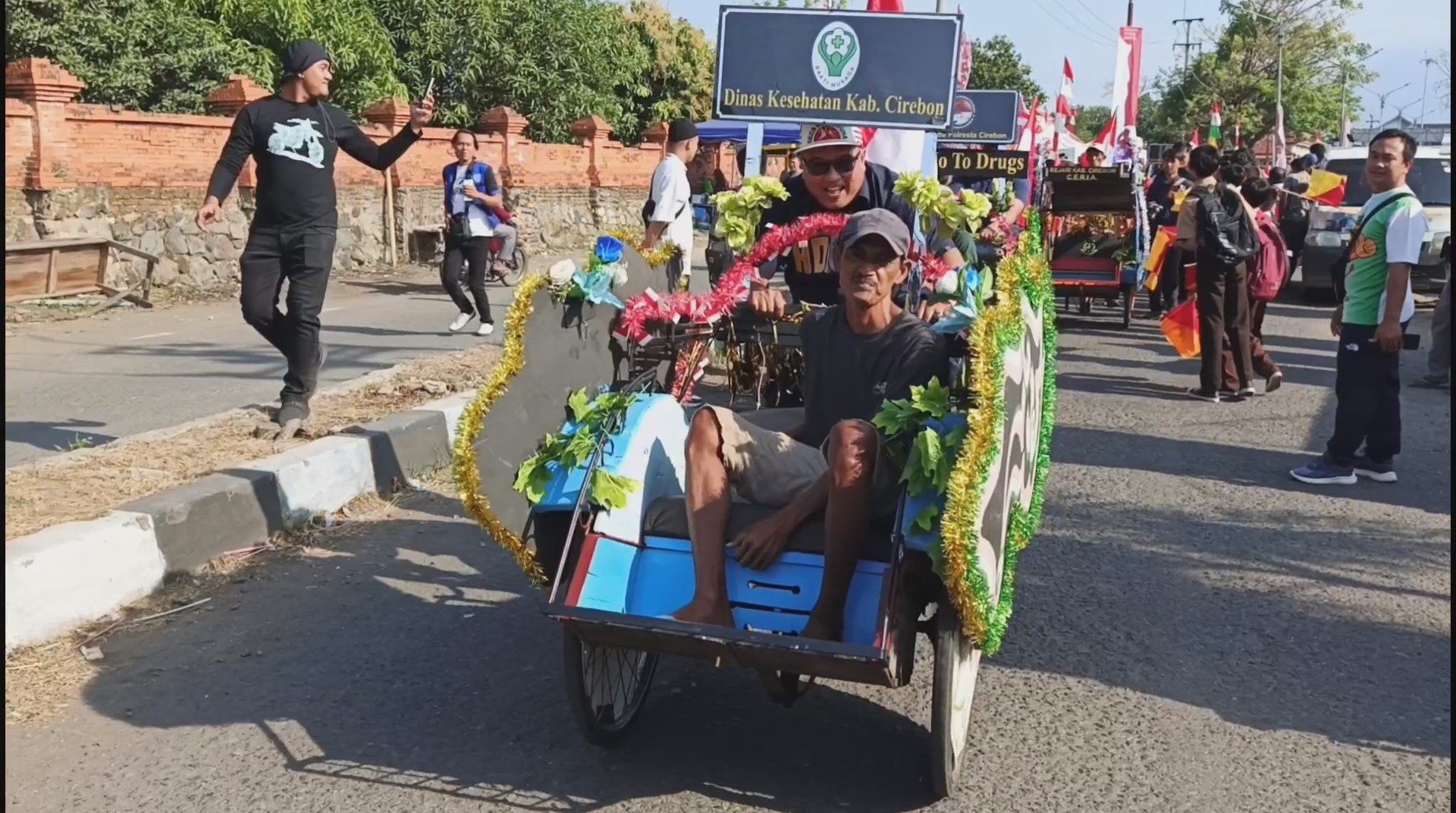 “Semua pejabat dari mulai bupati dan wakil bupati, sejumlah anggota DPRD Cirebon, Kapolres, Dandim, serta pejabat lainnya diwajibkan mengayuh becak hias yang ditumpangi tukang becak untuk memperingati HUT RI ke-80 untuk rutenya di kawasan wisata Trusmi sejauh lebih dari tiga kilometer sambil menyosialisasikan ajakan untuk kemajuan Kabupaten Cirebon” Ujar Bupati Cirebon, Imron Rosyadi