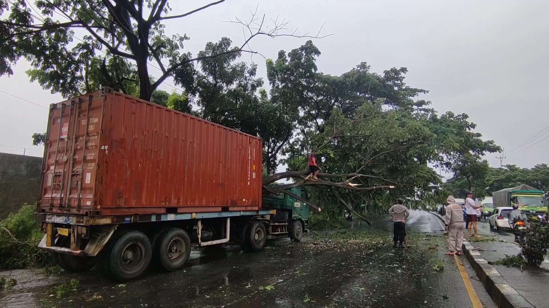 CIREBON, PILARadio – Hujan deras mengguyur Cirebon sejak pagi hari dan mengakibatkan sebuah pohon besar tumbang serta menimpa truk kontainer di Jalur Pantura, Pangenan, Kabupaten Cirebon, Jawa Barat, Rabu pagi. Pohon setinggi sepuluh meter tersebut menimpa bagian kontainer dan depan truk hingga menutup jalan. Akibatnya, arus lalu lintas di jalur transnasional mengalami kemacetan hingga lebih dari empat kilometer.