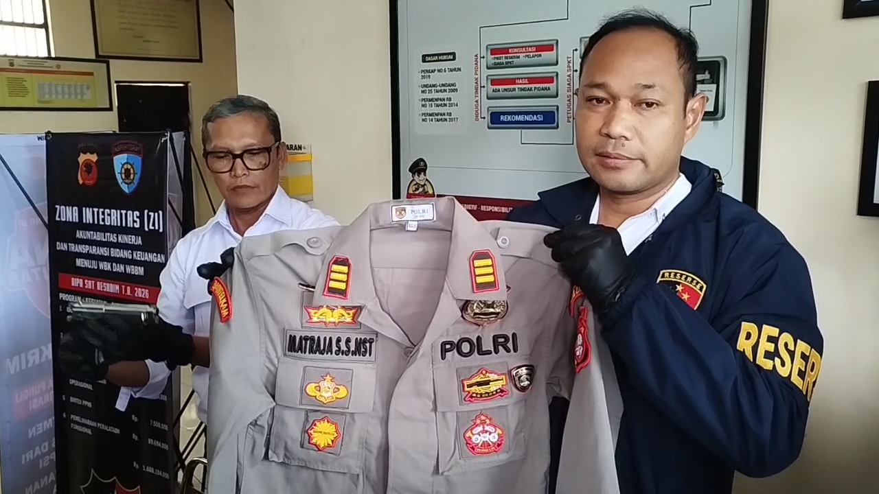 Petugas mengamankan barang bukti pakaian lengkap polisi, satu senapan angin laras panjang, dan dua pistol mainan. Dari pengakuan pelaku, ia mendapatkan seragam polisi dengan membeli secara daring.