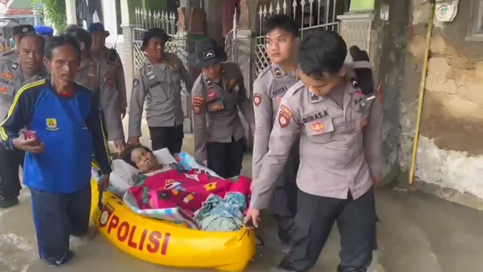 Hingga akhirnya, lansia tersebut berhasil ditandu menerjang banjir sebelum dibawa ke rumah sakit menggunakan mobil polisi.
