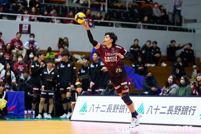 Setelah dua kali penyelamatan krusial dari Madsen, bola liar berhasil dikontrol dengan baik dan diarahkan kepada Farhan Halim. Tanpa ragu, Farhan langsung melompat tinggi dan melepaskan spike keras yang tak mampu dibendung blok lawan. Smash tajamnya sukses menghasilkan poin penting bagi VC Nagano Tridents.